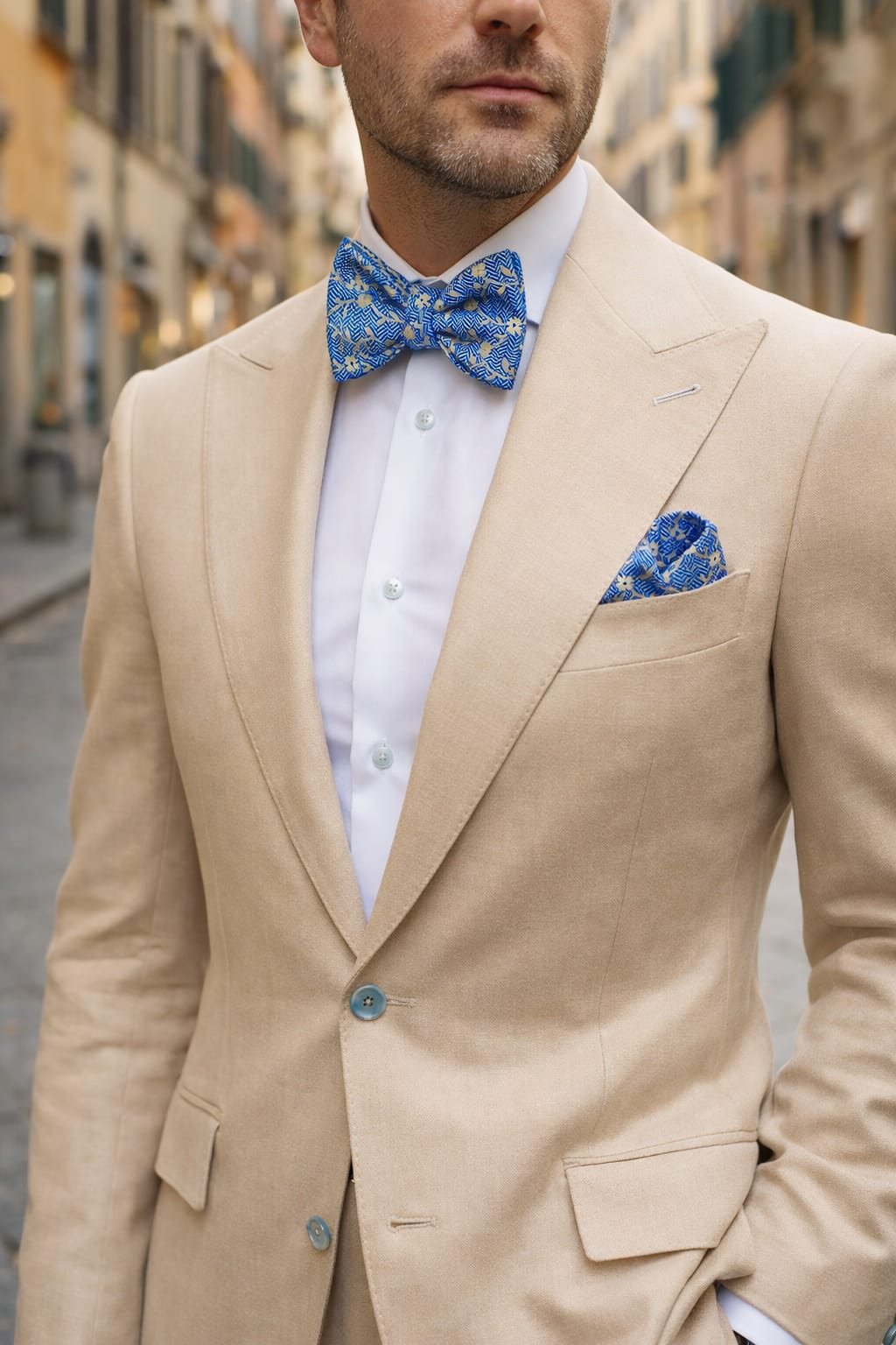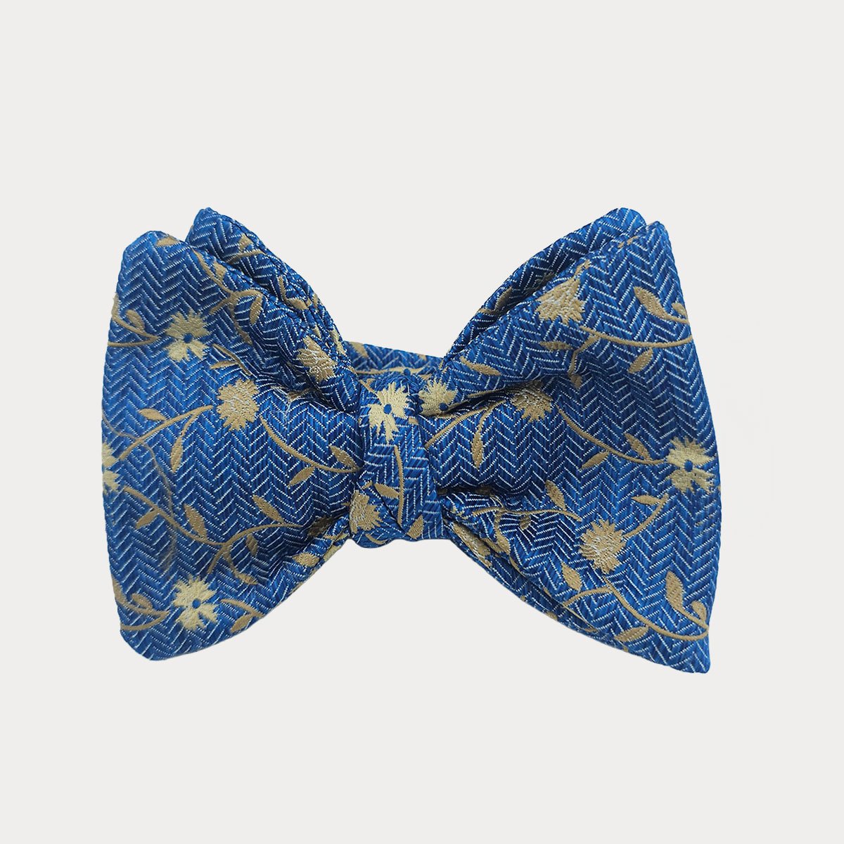 Blue Beige Floral Self Bow Tie Pocket Square Set