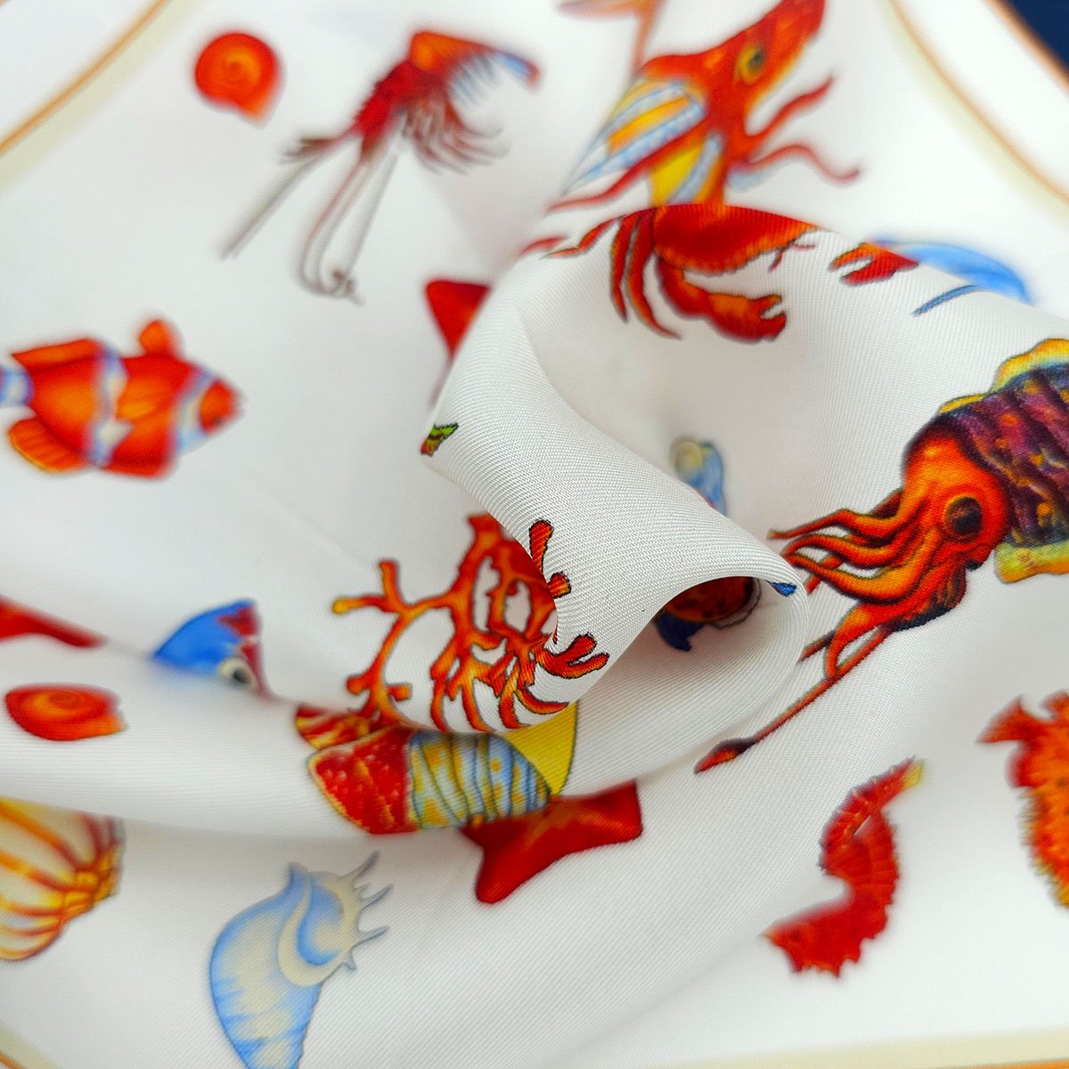 White Navy Edge Ocean Animals Pattern Pure Silk Pocket Square